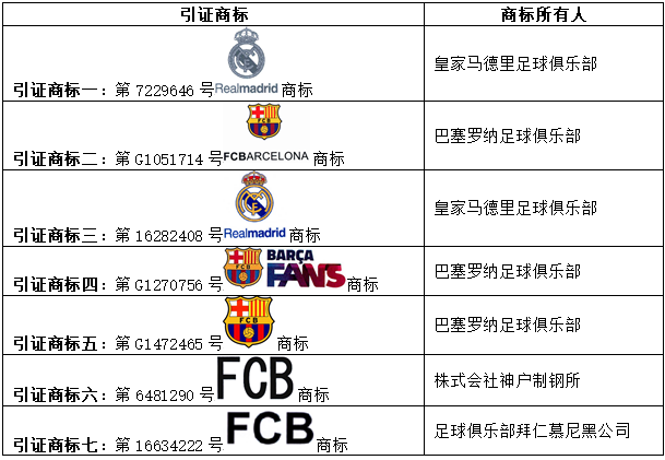 EL CLASICO MCF FCB及圖”(指定顏色)商標(biāo)由皇家馬德里足球俱樂部(REAL MADRID CLUB DE FUTBOL,簡稱“皇馬”)和巴塞羅納足球俱樂部(FUTBOL CLUB BARCELONA,簡稱“巴薩”)作為共同申請人申請,商標(biāo)構(gòu)成同時包括皇馬和巴薩雙方的隊徽“