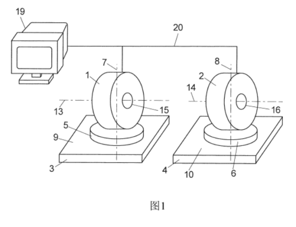 所述運動元件(1,2)相對于相應的中間元件(17,18)能夠彼此無關地分別圍繞第二運動軸線(11,12)運動,其中所述第二運動軸線(11,12)基本上平行于相應的所述基礎元件(3,4)的延伸面(9,10),基本上垂直于所述第一運動軸線(7,8)且基本上垂直于所述轉(zhuǎn)動軸線(13,14)伸展。
