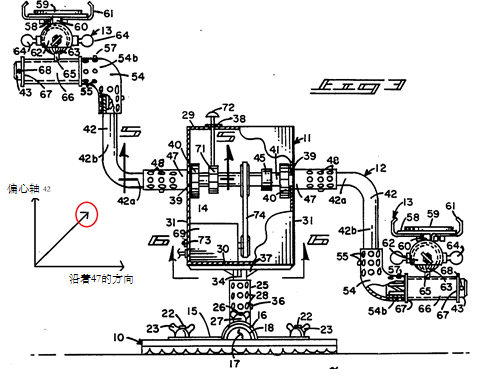 對比文件4僅僅公開了曲柄的轉(zhuǎn)動平面能夠圍繞通過銷57所限定的水平軸線來調(diào)整。然而,對比文件4中的曲柄不能夠被等同為案例中的“運動元件(17,18)”因為曲柄并非安裝在底板94上而是安裝在殼體90上。