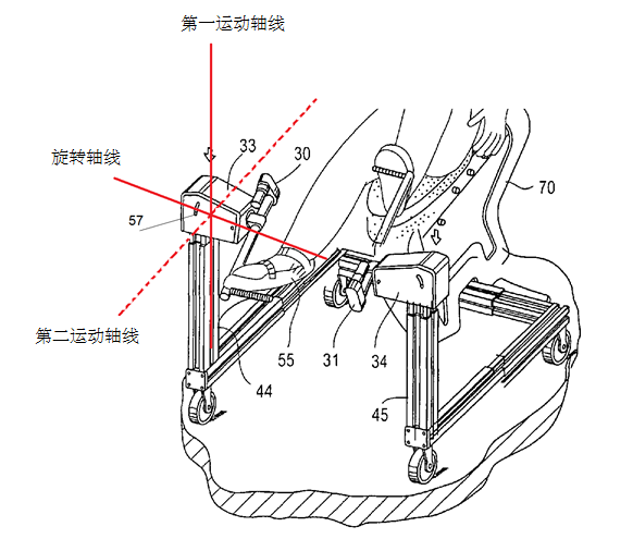 從對比文件4的圖5A中可見,審查員認為對比文件4中的沿著豎直方向的軸線等同于案例的權利要求1中的“第一運動軸線”,踏板55圍繞其轉(zhuǎn)動的轉(zhuǎn)動軸線等同于案例的權利要求1中的旋轉(zhuǎn)軸線,因此,通過銷57限定的軸線(以紅色虛線在圖5A中示出)等同于案例的權利要求1中的第二運動軸線。