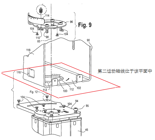 從對比文件4的圖9中可以看到,第二運動軸線位于紅色線框所示出的平面中。然而,螺釘98的肩部接合開口100的邊緣以將殼體90定位在該平面中。顯然,殼體90根本不可能圍繞該平面中的任何軸線轉(zhuǎn)動。也就是說,對比文件4并沒有公開案例的權利要求1中的技術特征“運動元件(1,2)能夠相對于相應的中間元件(17,18)彼此無關地圍繞第二運動軸線(11,12)運動”。