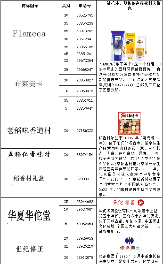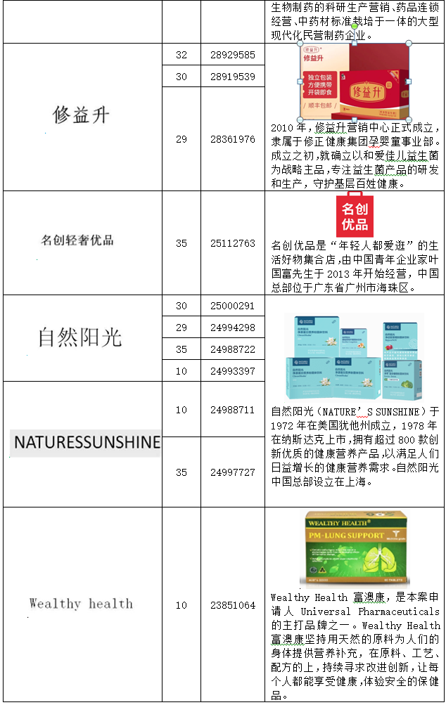 在分析系爭商標(biāo)申請人申請注冊商標(biāo)之時,需要對其申請的商標(biāo)進行逐一分析、比對,并闡述說明被搶注的商標(biāo)的真實權(quán)利人的情況,并提供參考證據(jù)。如第23851064號“WEALTHY HEALTH”商標(biāo)無效宣告案(系爭商標(biāo)申請人共申請156件商標(biāo))中,代理人發(fā)現(xiàn)該商標(biāo)申請人北京鑫鵬福元商貿(mào)有限公司申請的多件商標(biāo)與其他具有強顯著性和知名度的商標(biāo)相同或者近似,且被搶注的商標(biāo)的真實權(quán)利人根據(jù)查詢均可以一一對應(yīng)。通過列表,這些系爭商標(biāo)申請人搶注他人的情況可以很清晰的展示出來。