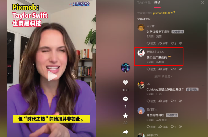 本案中,系爭商標(biāo)被系爭商標(biāo)申請人申請在第11類商品上,同時系爭商標(biāo)申請人同時也生產(chǎn)發(fā)光手環(huán)商品,與申請人處于同一商業(yè)領(lǐng)域。系爭商標(biāo)申請人僅申請了9枚商標(biāo),數(shù)量較少。在調(diào)查系爭商標(biāo)申請人行動之時,代理人發(fā)現(xiàn)系爭商標(biāo)申請人的關(guān)聯(lián)公司在抖音社交媒體關(guān)于國際巨星、歌手Taylor Swift(泰勒斯威夫特)的演唱會上使用申請人的PIXMOB發(fā)光手環(huán)的視頻下面(見下圖),主動聲稱該手環(huán)為其公司生產(chǎn)制造。代理人立刻對該證據(jù)進行了固定。