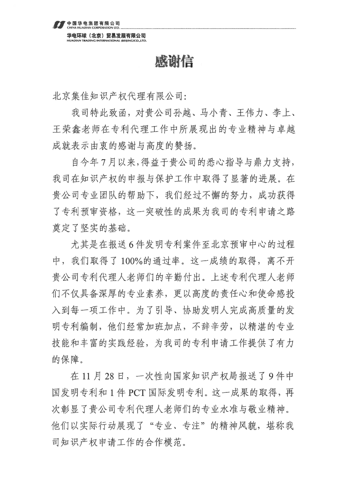 信中提到,在集佳專業(yè)團(tuán)隊(duì)的幫助下,華電環(huán)球的專利申請工作取得顯著進(jìn)展,多次順利完成專利申請報(bào)送。優(yōu)異的成績來之不易,在提供服務(wù)過程中,集佳專利代理師們不辭辛勞、加班加點(diǎn),協(xié)助發(fā)明人完成高質(zhì)量的發(fā)明專利編制,既反映了集佳團(tuán)隊(duì)深厚的專業(yè)素養(yǎng)與豐富經(jīng)驗(yàn),也彰顯了集佳專業(yè)人員高度敬業(yè)的責(zé)任心與精神風(fēng)貌??蛻舯硎?,相信集佳在未來的合作中能夠繼續(xù)以專業(yè)的精神和優(yōu)質(zhì)的服務(wù)為客戶的知識(shí)產(chǎn)權(quán)工作提供有力保障,期待雙方進(jìn)一步加深合作,共同創(chuàng)造更加輝煌的成果!