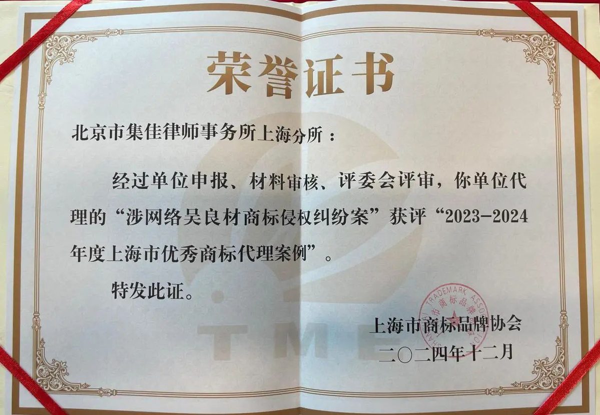 2025年1月7日,上海市商標(biāo)品牌協(xié)會(huì)召開(kāi)第六屆會(huì)員代表大會(huì),會(huì)上表彰了被評(píng)為2023-2024年度“上海市優(yōu)秀商標(biāo)代理案例”及“上海市優(yōu)秀商標(biāo)代理案例提名”的案例,集佳上海分所的兩個(gè)案例成功入選。