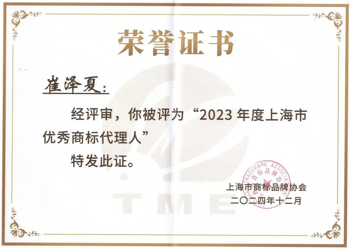 集佳上海分所崔澤夏律師被評為2023年度“上海市優(yōu)秀商標(biāo)代理人”。