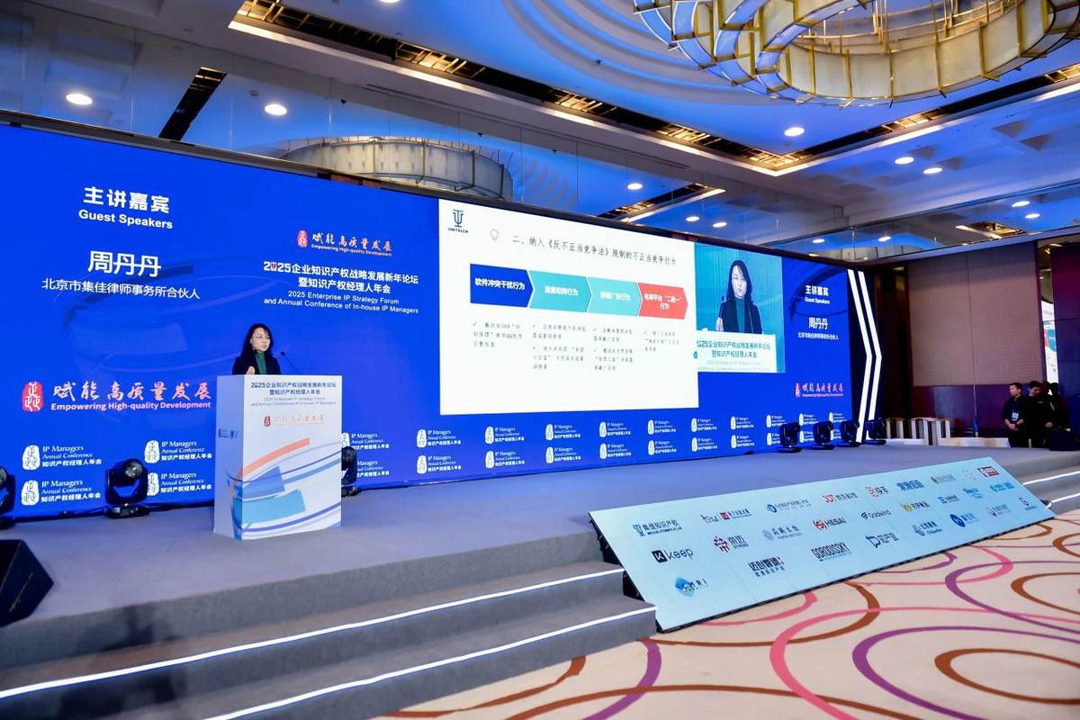 本次年會以“賦能高質量發(fā)展”為主題,深入探討大數據、人工智能等前沿技術在企業(yè)知識產權領域的創(chuàng)新應用。受主辦方邀約,集佳合伙人周丹丹律師為此次大會帶來主題演講,她圍繞 “《反不正當競爭法》修改對企業(yè)知識產權工作的影響”這一主題,詳細說明了此次《反不正當競爭法》(草案)的主要修訂核心內容,分享了對《反不正當競爭法》修改趨向的思考,并結合近十年不正當競爭領域的典型案例和多年代理競爭類案件的實戰(zhàn)經驗對企業(yè)提出一系列企業(yè)競爭行為的合規(guī)建議,引發(fā)現場嘉賓與知識產權從業(yè)者的關注與探討。