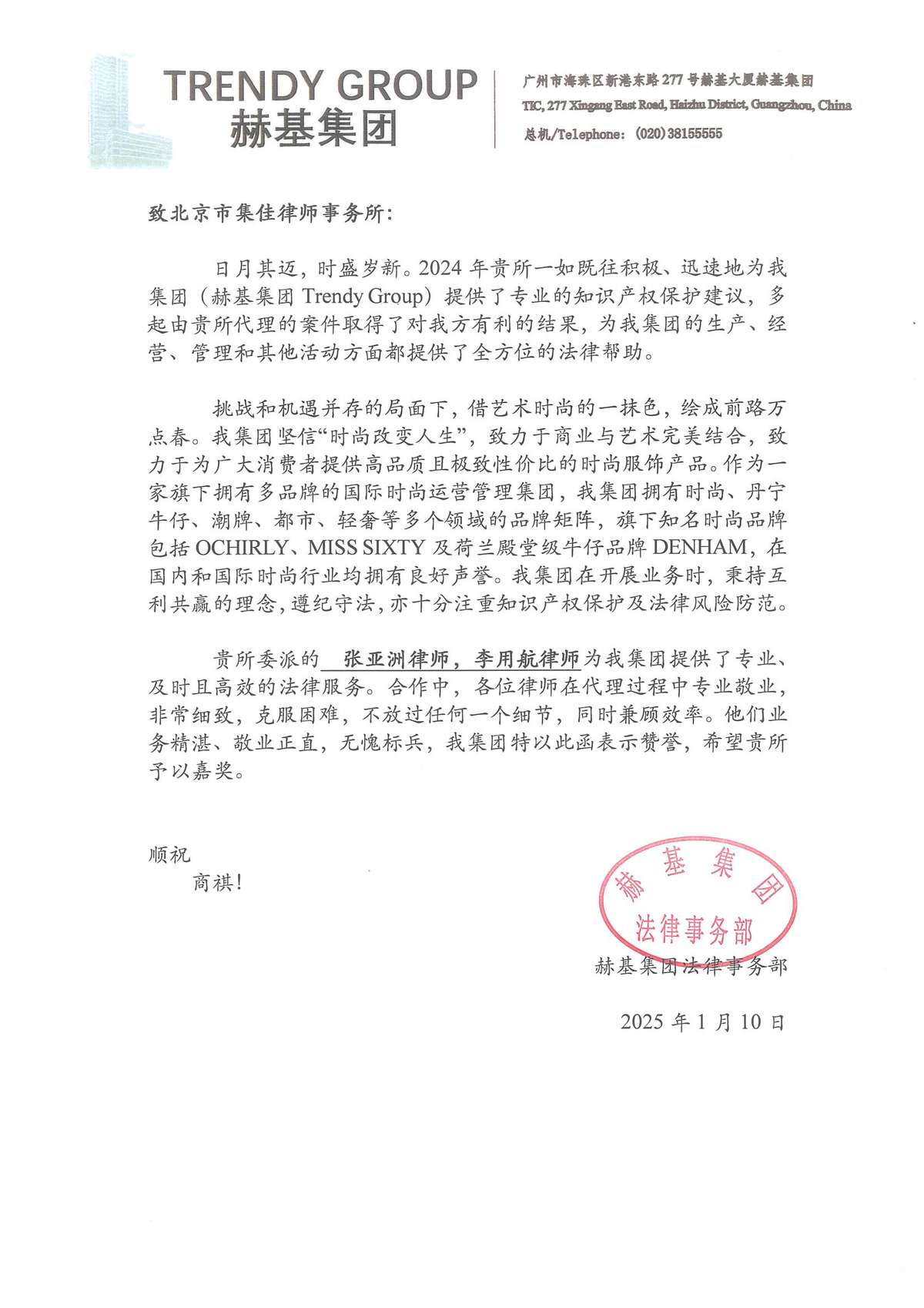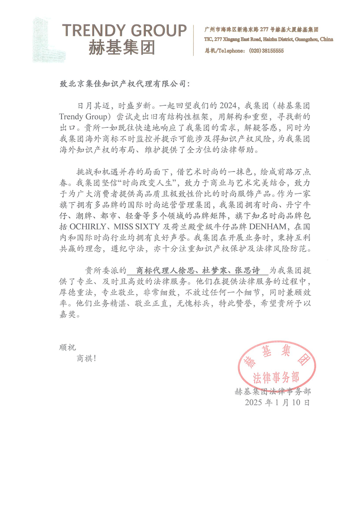 信中指出,集佳在2024年一如既往、迅速地為赫基集團(tuán)提供了專業(yè)的知識產(chǎn)權(quán)保護(hù)建議,多起由集佳代理的案件取得了對赫基集團(tuán)有利的結(jié)果,為赫基集團(tuán)的生產(chǎn)、經(jīng)營、管理和其他活動方面都提供了全方位的法律幫助。