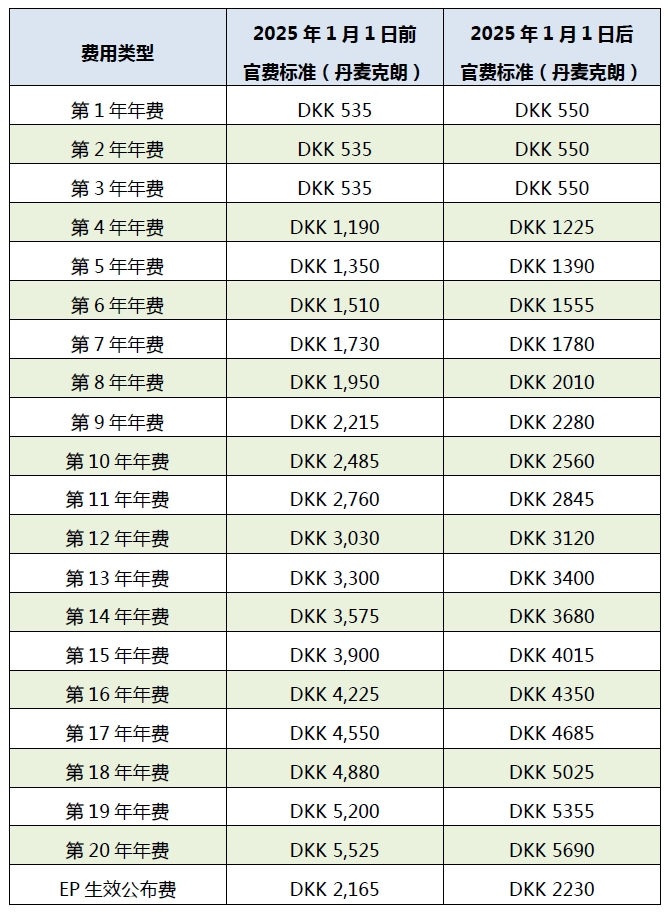 2025年1月7日,丹麥專利商標(biāo)局在其官網(wǎng)上公布,對包括已生效的歐洲專利在內(nèi)的專利公布和續(xù)展費用進行價格調(diào)整,費用上漲了約3.0%。此次調(diào)整自2025年1月1日起生效。