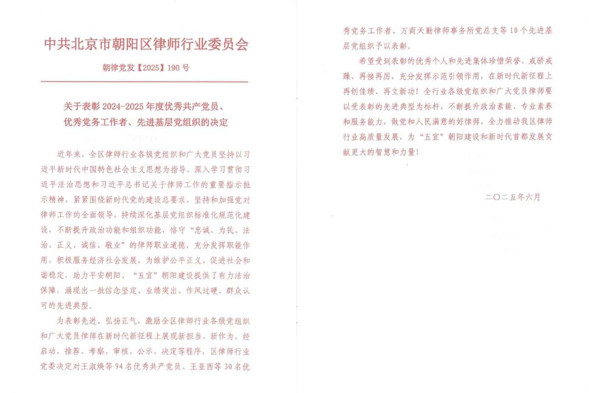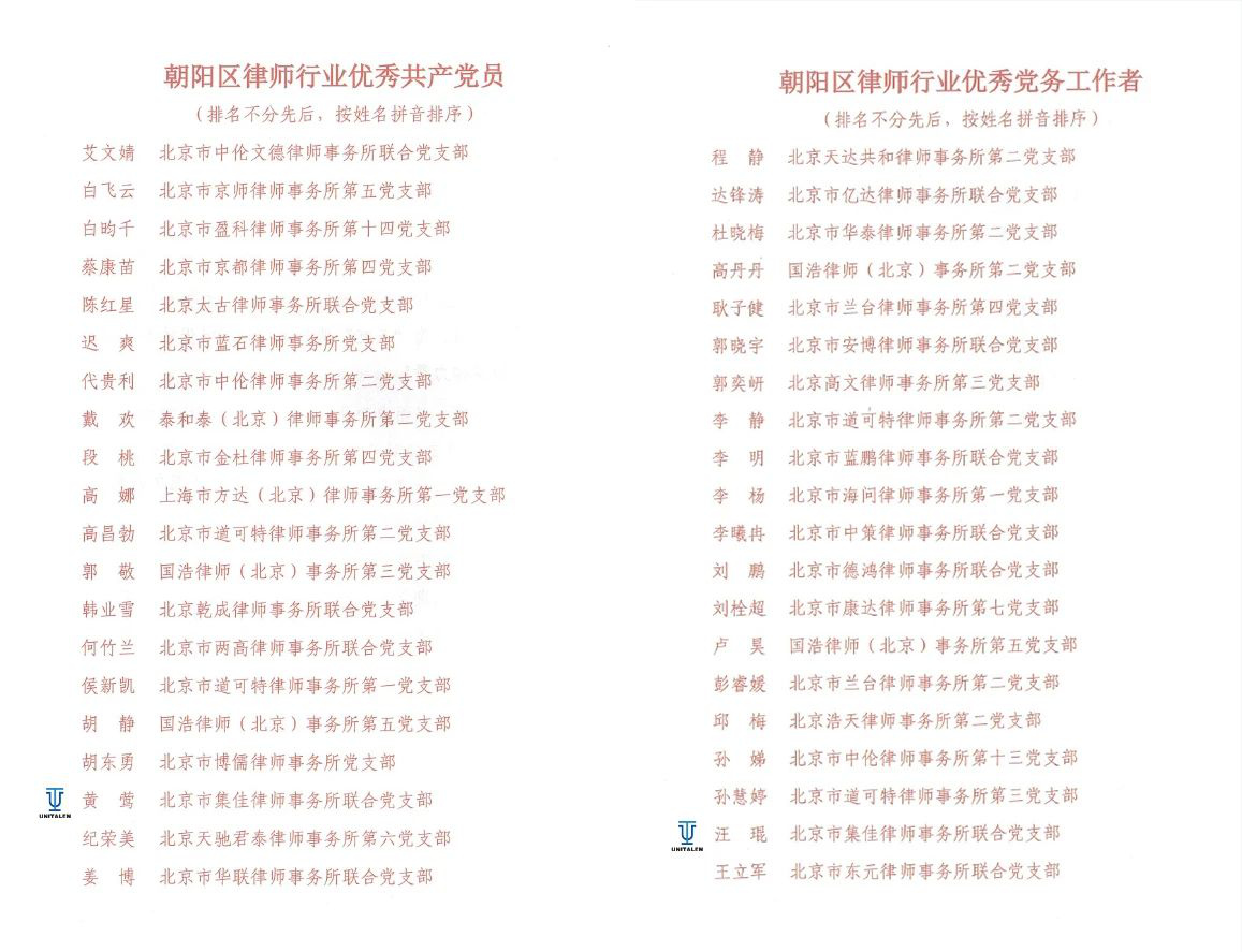 6月27日,朝陽區(qū)律師行業(yè)黨委召開了朝陽區(qū)律師行業(yè)慶祝中國共產(chǎn)黨成立104周年暨總結(jié)表彰大會,集佳律所聯(lián)合黨支部黨員黃鶯榮獲“朝陽區(qū)律師行業(yè)優(yōu)秀共產(chǎn)黨員”稱號,支部黨員汪琨榮獲“朝陽區(qū)律師行業(yè)優(yōu)秀黨務工作者”稱號。
