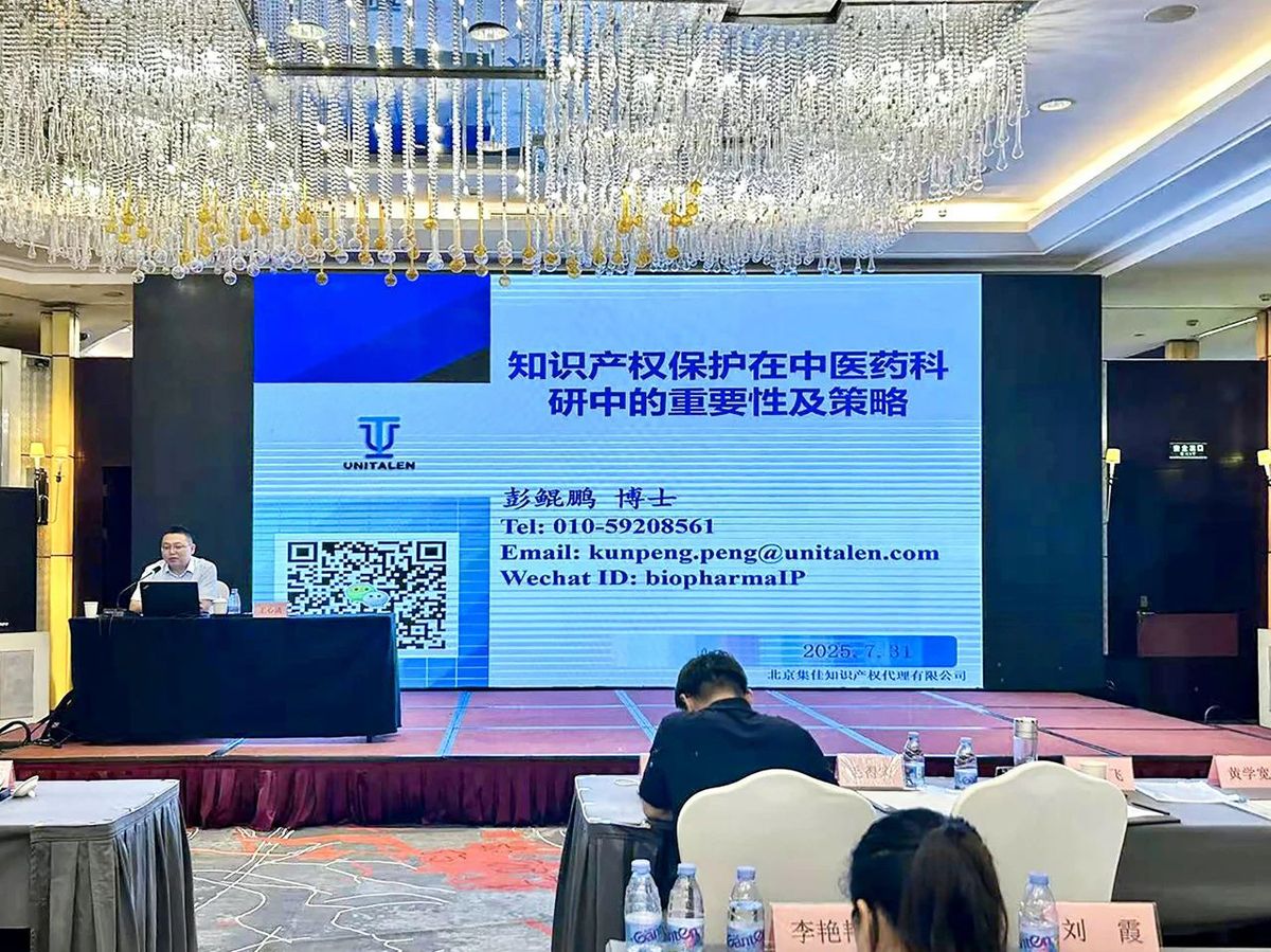 2025年7月31日,重慶市衛(wèi)生健康委員會主辦的 “2025年全市中醫(yī)藥科技創(chuàng)新能力提升培訓(xùn)班” 在重慶歐瑞大酒店舉行。集佳合伙人彭鯤鵬博士受邀主講 “知識產(chǎn)權(quán)保護(hù)在中醫(yī)藥科研中的重要性及策略”,為全市二級以上公立中醫(yī)醫(yī)療機構(gòu)分管領(lǐng)導(dǎo)、科研負(fù)責(zé)人及巴渝岐黃學(xué)者等帶來專業(yè)解讀,助力中醫(yī)藥科研成果轉(zhuǎn)化與權(quán)益保護(hù)。