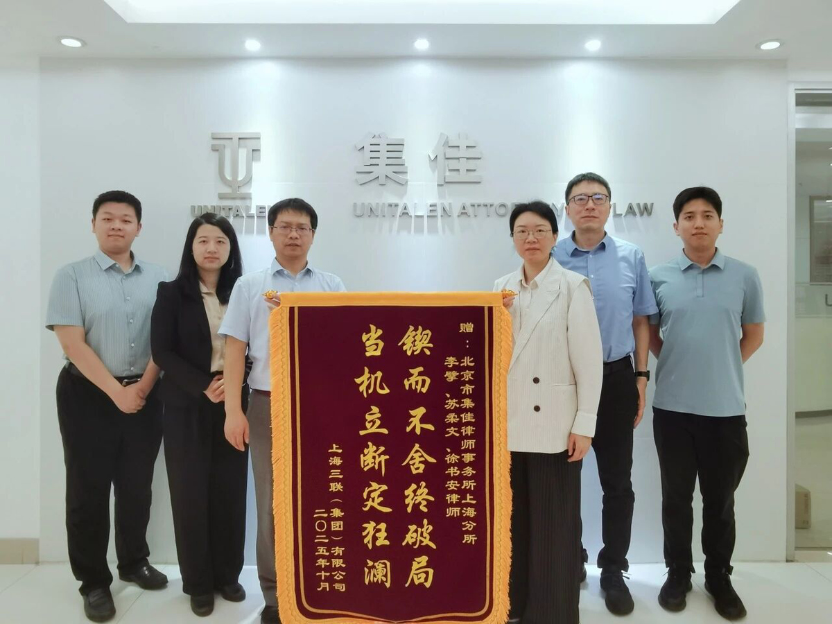 近日,集佳上海分所代理的上海三聯(lián)(集團(tuán))有限公司(以下簡(jiǎn)稱(chēng)“上海三聯(lián)集團(tuán)”)與上海某公司、大豐某公司等侵害商標(biāo)權(quán)及不正當(dāng)競(jìng)爭(zhēng)糾紛案的執(zhí)行取得重大進(jìn)展,上海三聯(lián)集團(tuán)代表專(zhuān)程蒞臨集佳上海分所,送來(lái)表?yè)P(yáng)錦旗。